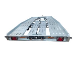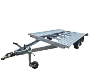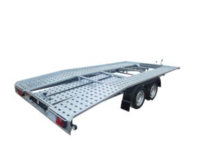 Laweta NEPTUN N27-420 2 atb [GN211] – hamowana, profesjonalna przyczepa do przewozu aut ze stabilną, perforowaną platformą i tandemem osi. Idealna do transportu samochodów w salonach, komisach i serwisach.