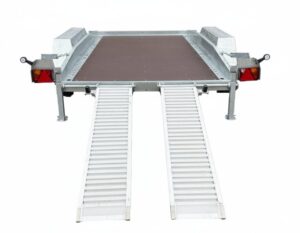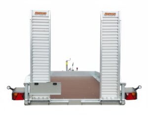 Aluminiowe podjazdy umożliwiają wygodny załadunek, a liczne uchwyty mocujące zwiększają bezpieczeństwo transportu. Wytrzymały dyszel V-kształtny zapewnia stabilne prowadzenie przyczepy nawet przy pełnym obciążeniu.